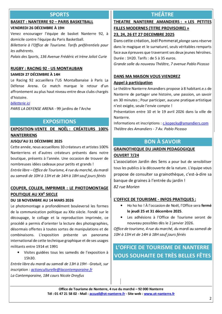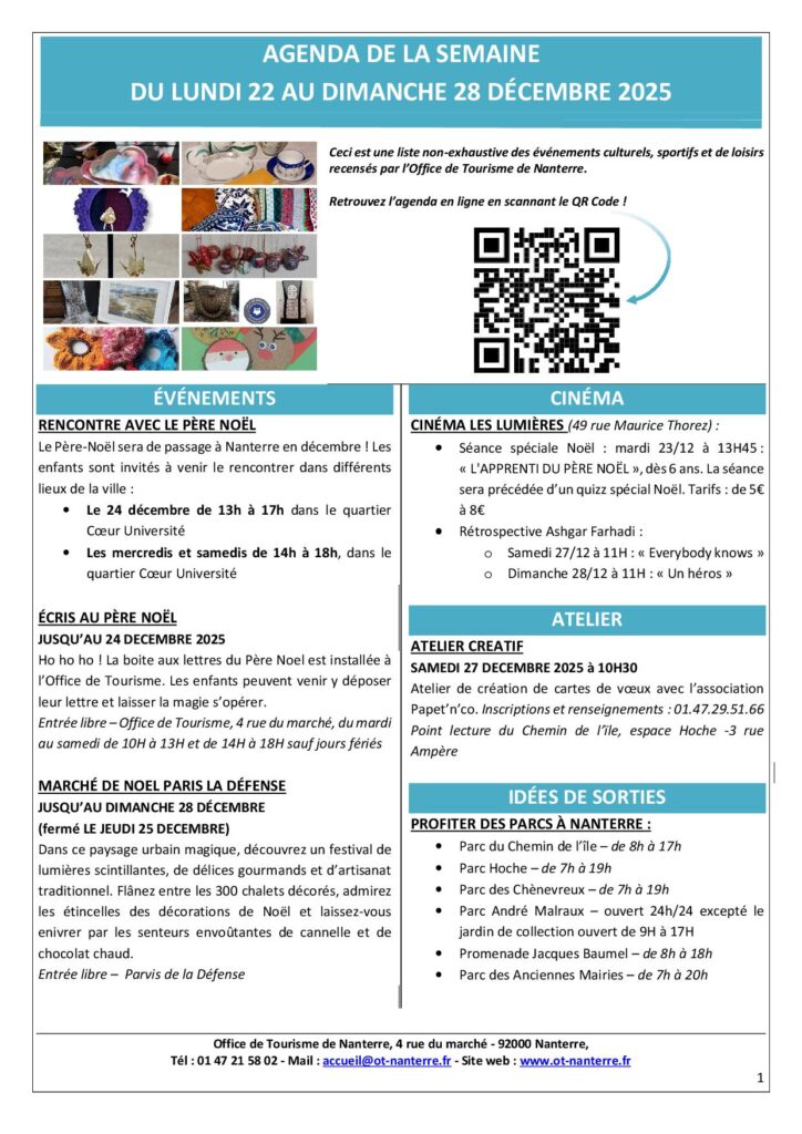 Vous cherchez des idées d’activités ou de sorties à Nanterre ? Composez votre propre programme grâce à toutes les idées de sortie de la semaine regroupées dans notre agenda de la semaine. Pour le consulter, il vous suffit de cliquer sur les images pour qu’elles s’agrandissent. Il est disponible ci-dessous en version PDF.