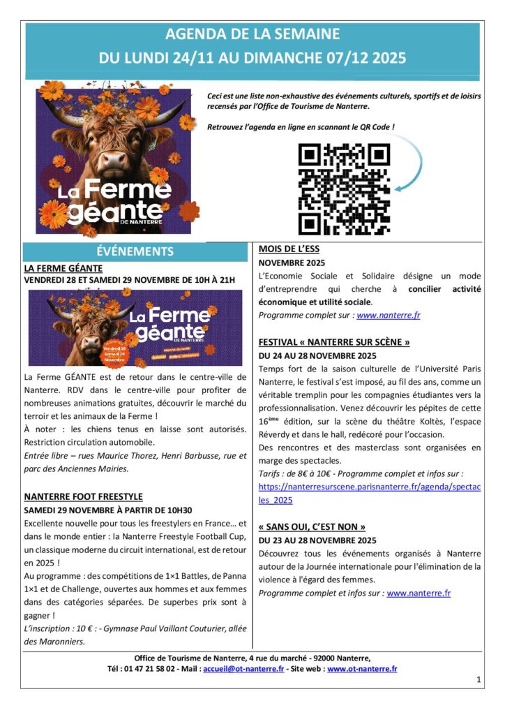 Vous cherchez des idées d’activités ou de sorties à Nanterre ? Composez votre propre programme grâce à toutes les idées de sortie de la semaine regroupées dans notre agenda de la semaine. Pour le consulter, il vous suffit de cliquer sur les images pour qu’elles s’agrandissent. Il est disponible ci-dessous en version PDF.