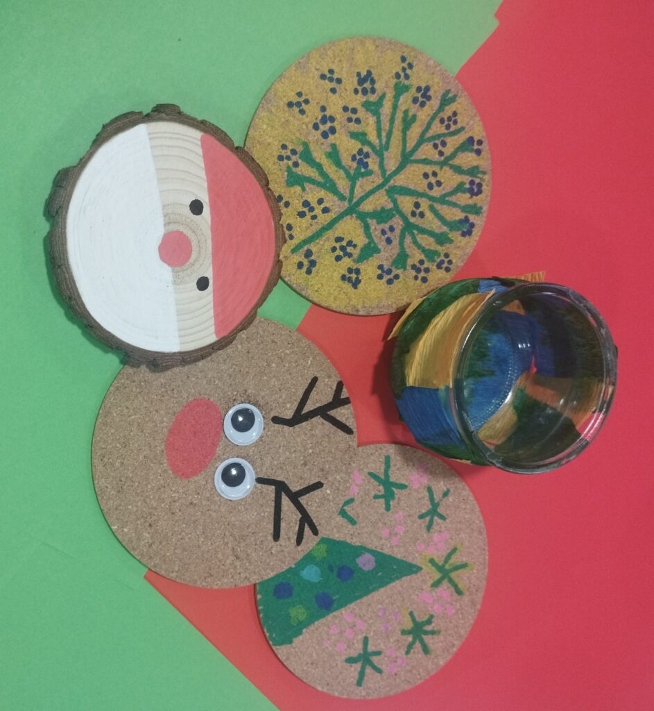 • De charmants dessous de verre décorés avec des Pères Noël et autres personnages hivernaux